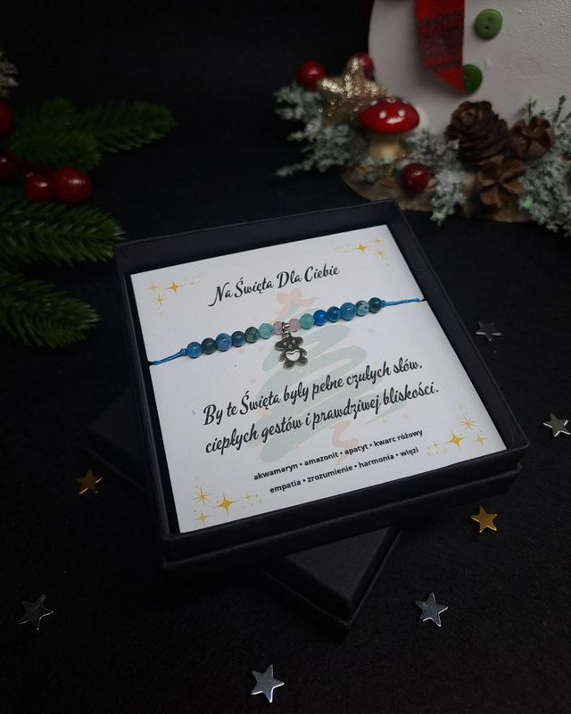 Bransoletka „Czułe Święta” to drobny, ale niezwykle symboliczny upominek, który niesie ze sobą ciepło, bliskość i łagodność — wartości, które w świątecznym czasie liczą się najbardziej. Jej błękitno–miętowe odcienie przywodzą na myśl zimowe światło, spokojne poranki i atmosferę pełną dobroci.
