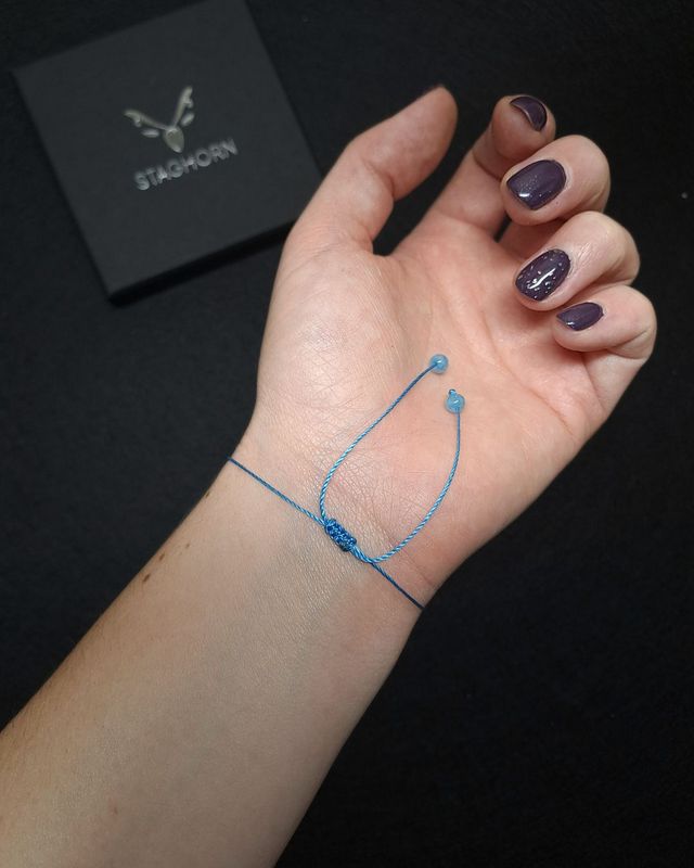 Błękitny sznurek makramowy z regulowanym zapięciem — bransoletka pasuje na każdy nadgarstek.