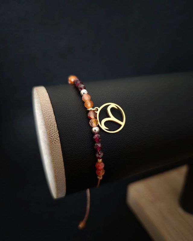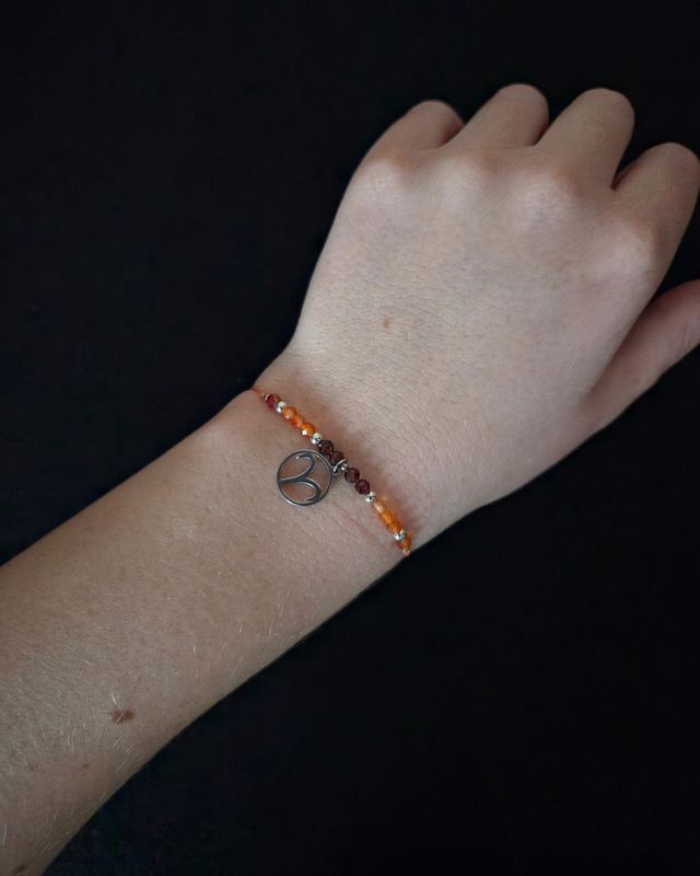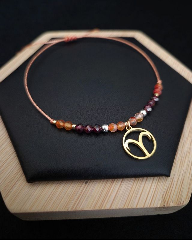 Energetyczna bransoletka zodiakalna dla Barana, wykonana z karneolu, hematytu i granatu. Symbol odwagi, pasji i wewnętrznej siły – osobisty talizman dla osób, które idą własną drogą.