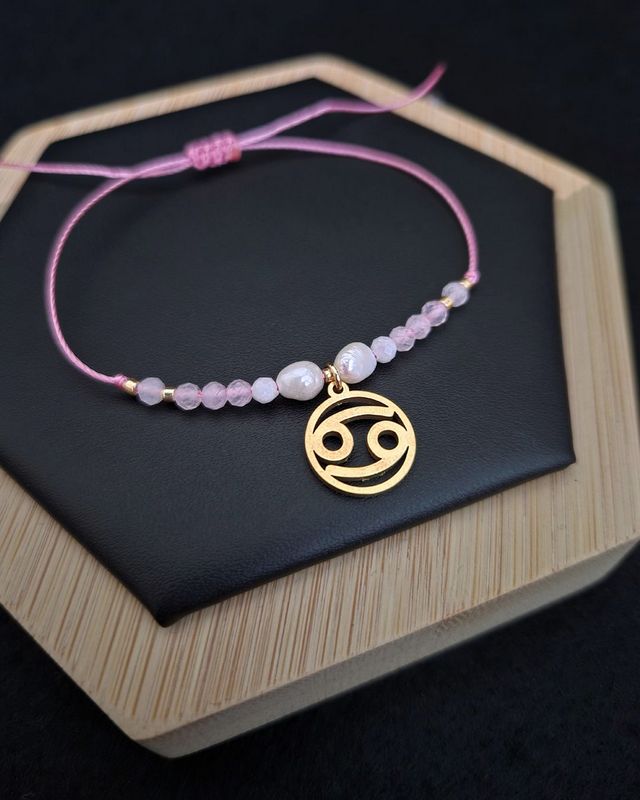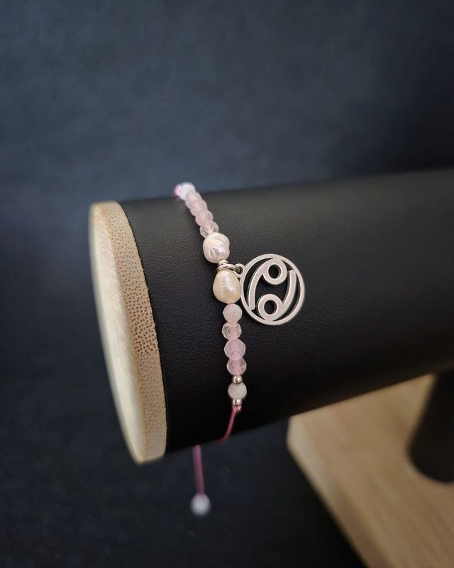 Subtelna bransoletka zodiakalna dla Raka, wykonana z kamienia księżycowego, perły i kwarcu różowego. Talizman emocjonalnej harmonii, intuicji i bliskości.