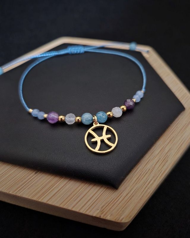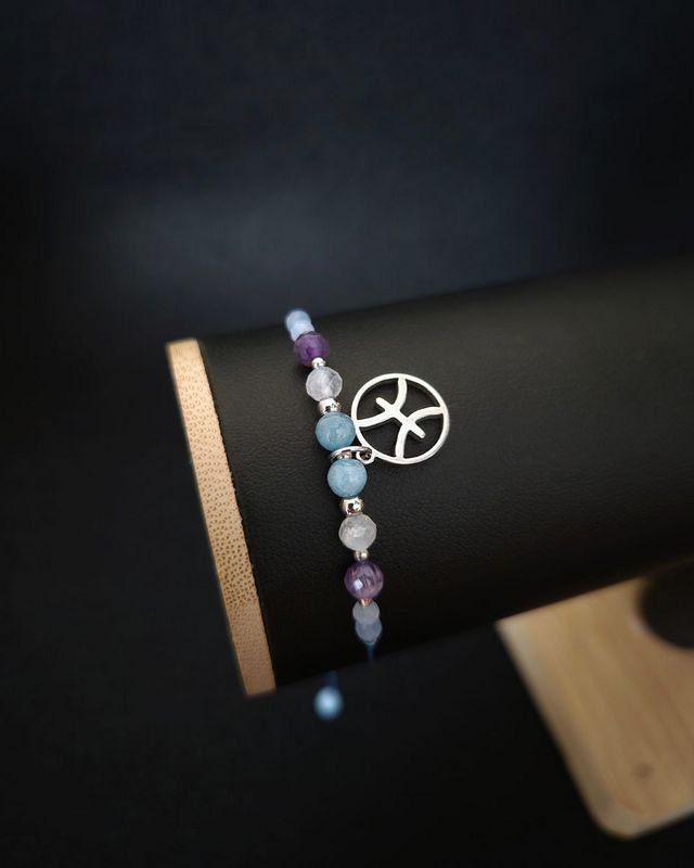 Subtelna bransoletka zodiakalna dla Ryb, wykonana z ametystu, kamienia księżycowego i akwamarynu. Delikatny talizman intuicji, spokoju i emocjonalnej harmonii.