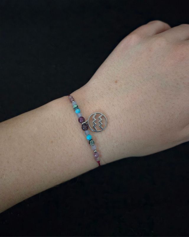 Bransoletka Zodiakalna „Wodnik” to nowoczesna, lekka i inspirująca kompozycja stworzona z myślą o osobach urodzonych pod tym znakiem — niezależnych, kreatywnych, intuicyjnych i idących własną drogą. Połączenie chłodnych odcieni błękitu akwamarynu, fioletu ametystu i świeżego turkusu oddaje wolność myśli, innowacyjność oraz duchową otwartość Wodnika. Fioletowy sznurek makramowy podkreśla kreatywność i niezależność, tworząc biżuterię o wyraźnej, ale lekkiej energii. To osobisty talizman intuicji, autentyczności i wewnętrznej wolności.