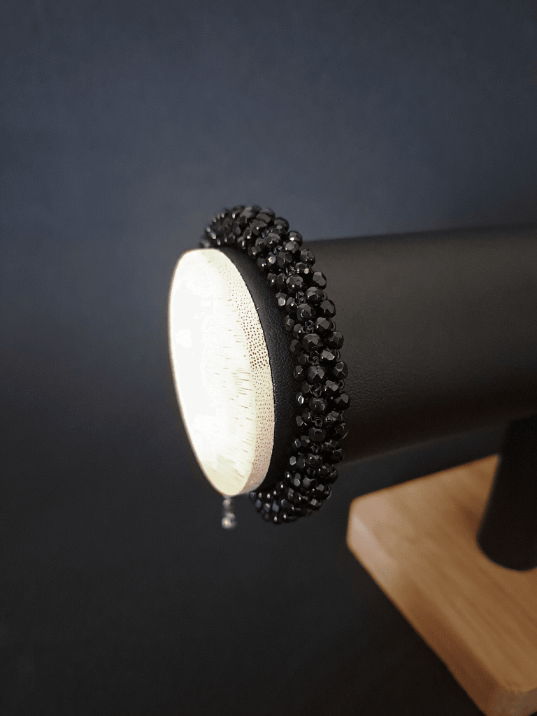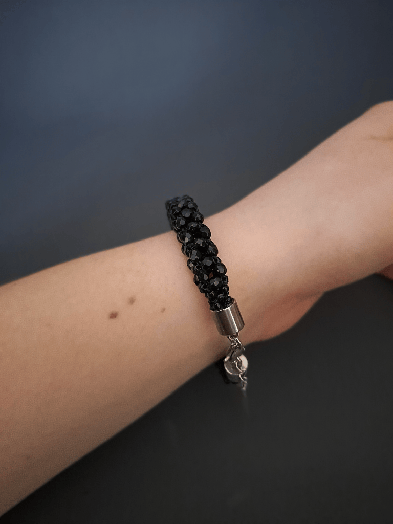Czarna bransoletka z kryształków Fire Polish to efekt pasji i miłości do detali. Tworzona ręcznie z najpiękniejszych czeskich kryształków, zachwyca swoją jakością i blaskiem. To biżuteria, która opowiada historię – niepowtarzalna, tak jak Ty. Idealny przykład rzemiosła, które łączy piękno z trwałością.