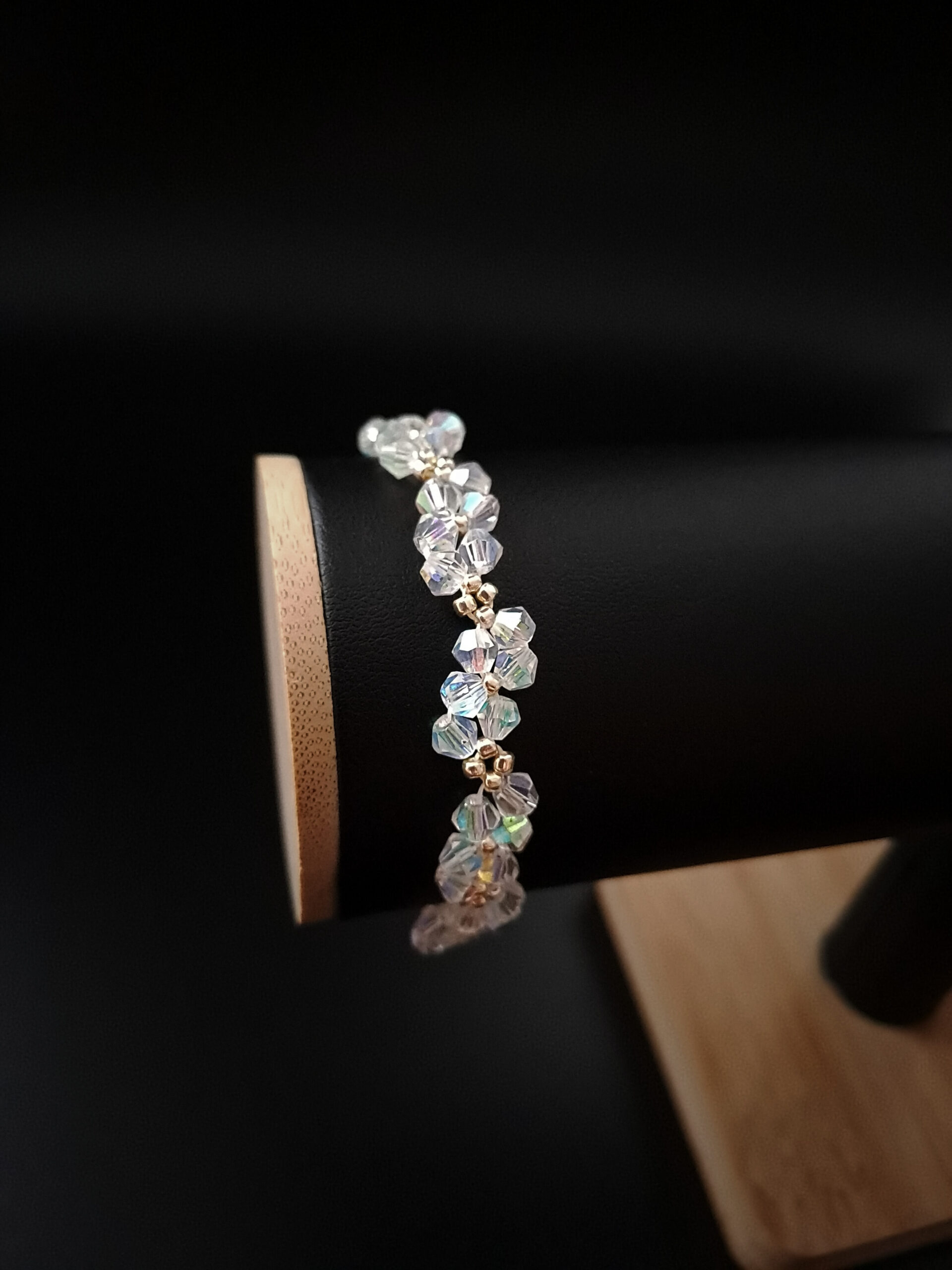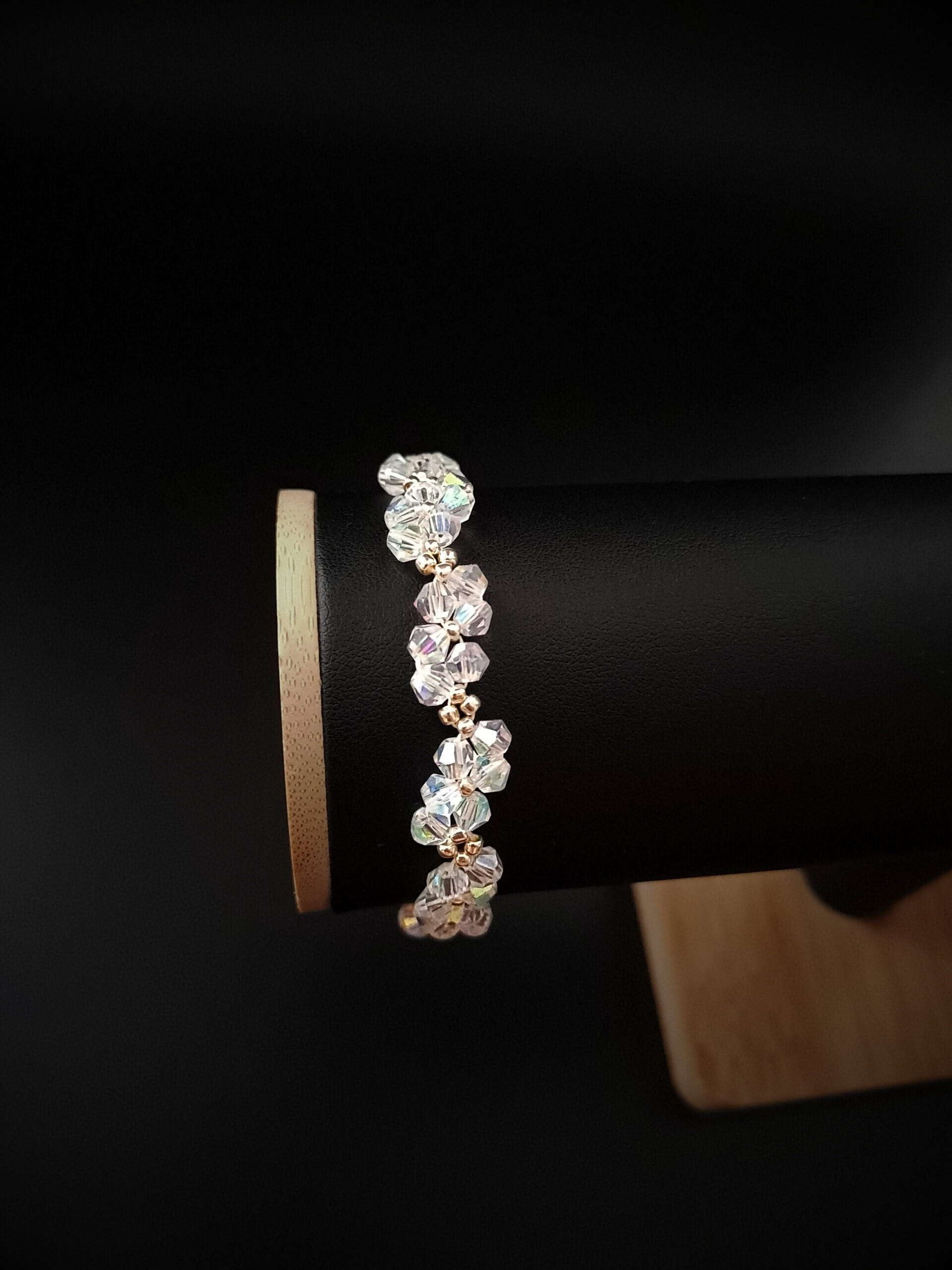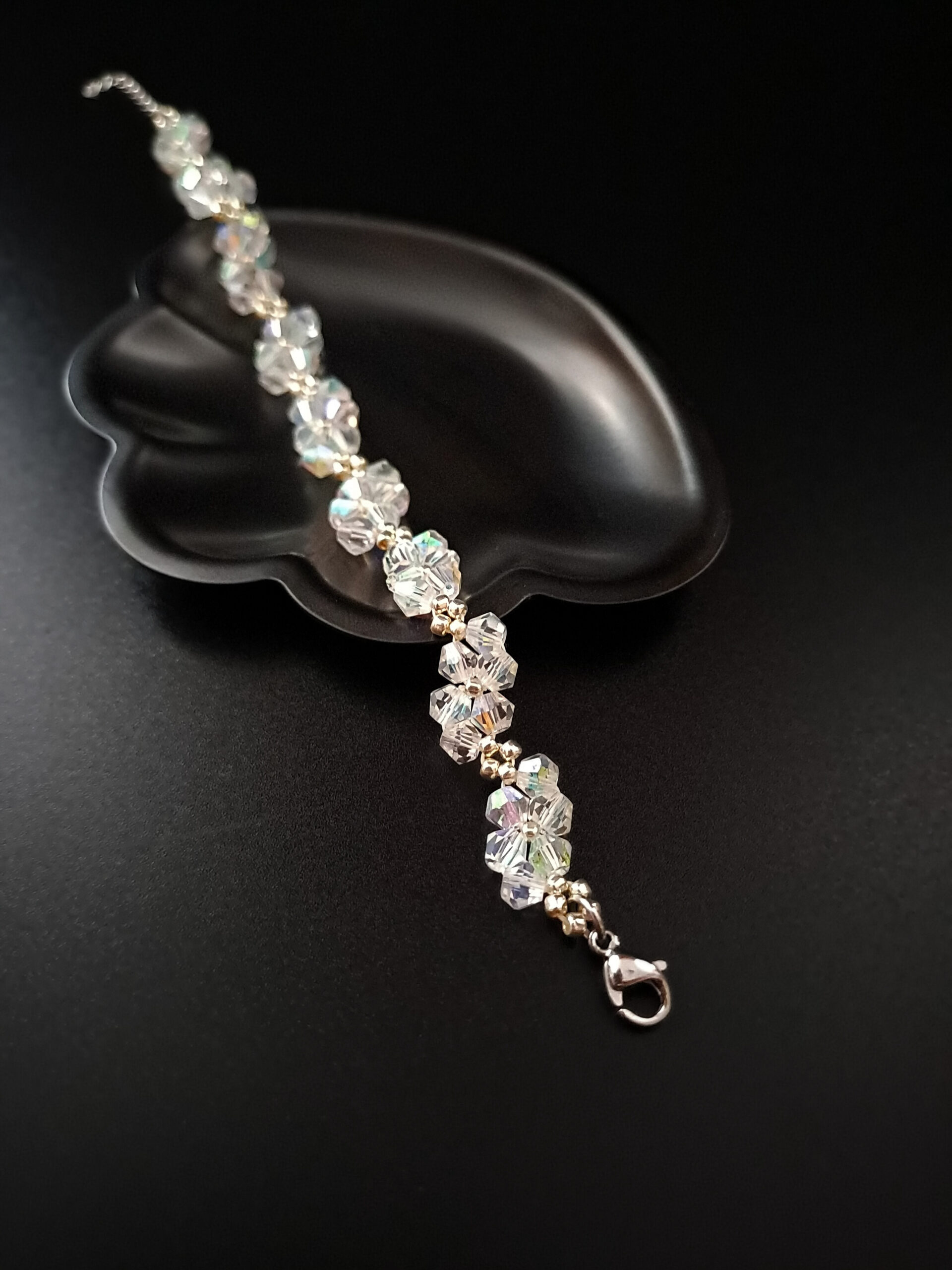 Ta delikatna bransoletka ślubna która łączy w sobie subtelność i luksus. Ręcznie wykonana z kryształków Crystal AB oraz koralików Toho, ta bransoletka to doskonały wybór na wyjątkowe okazje, takie jak ślub czy rocznice. Jej delikatny, ale efektowny design sprawia, że każda kobieta poczuje się w niej niezwykle elegancko.