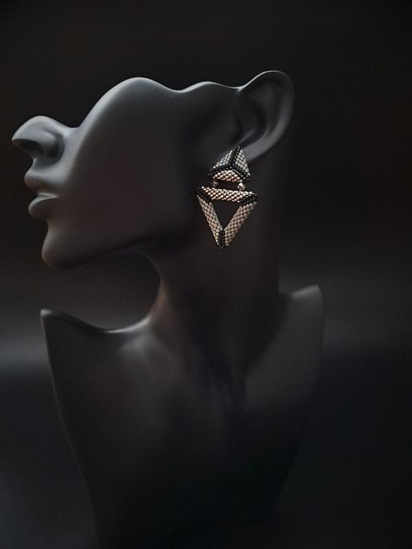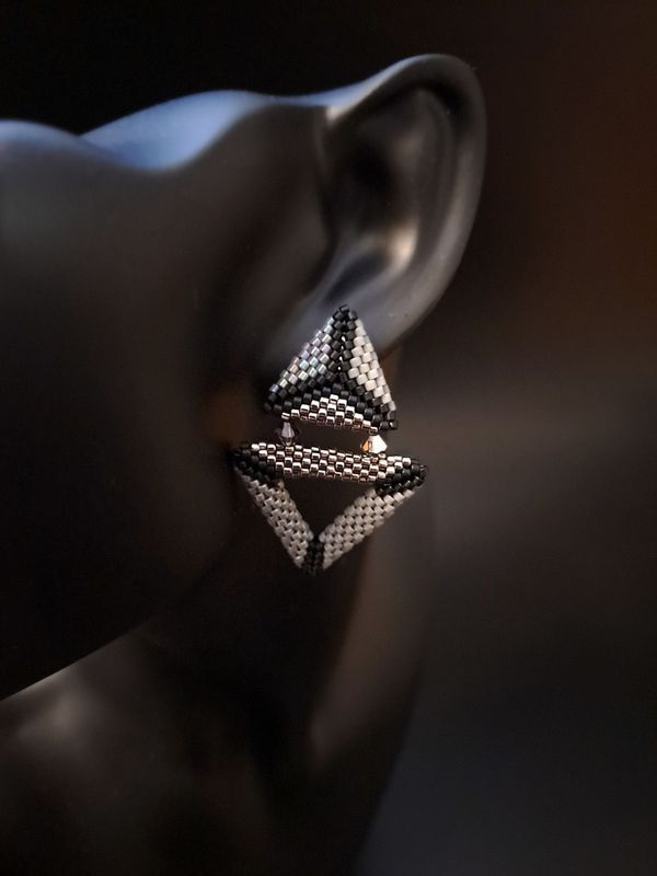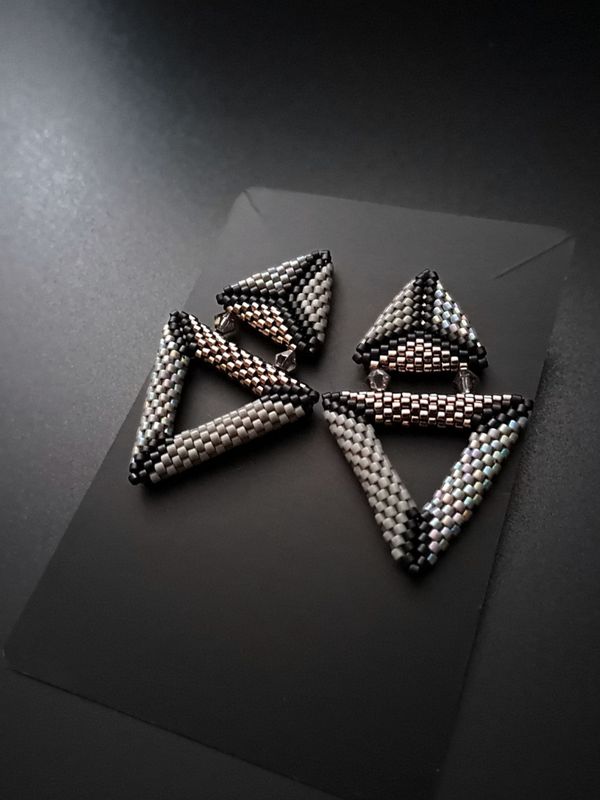 Kolczyki zostały wykonane techniką peyote z użyciem koralików Miyuki Delica, co gwarantuje ich trwałość oraz staranność wykonania. Każdy detal – od małych trójkątów oplatających sztyfty, po większe elementy połączone srebrnymi kryształkami Preciosa Bicone – został zaprojektowany z myślą o elegancji i wyrafinowaniu. Ręczne wykonanie sprawia, że każda para kolczyków jest unikalna i wyjątkowa.