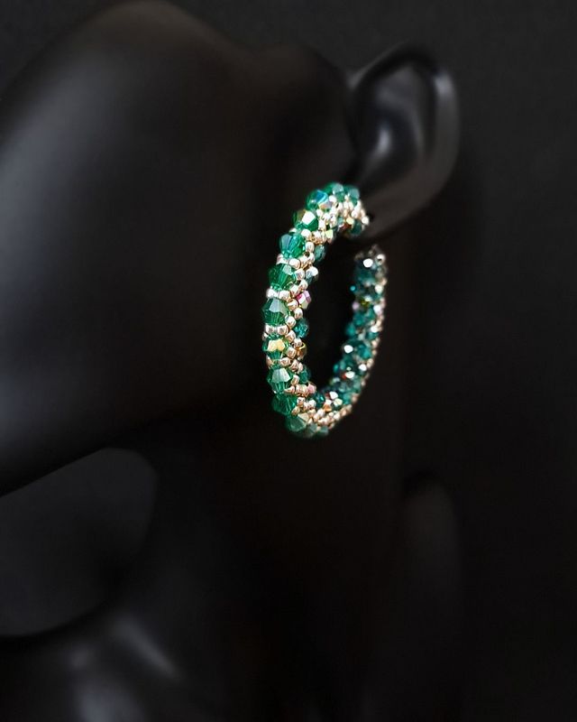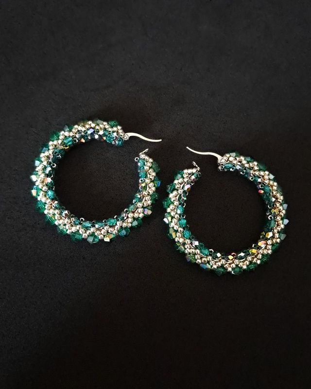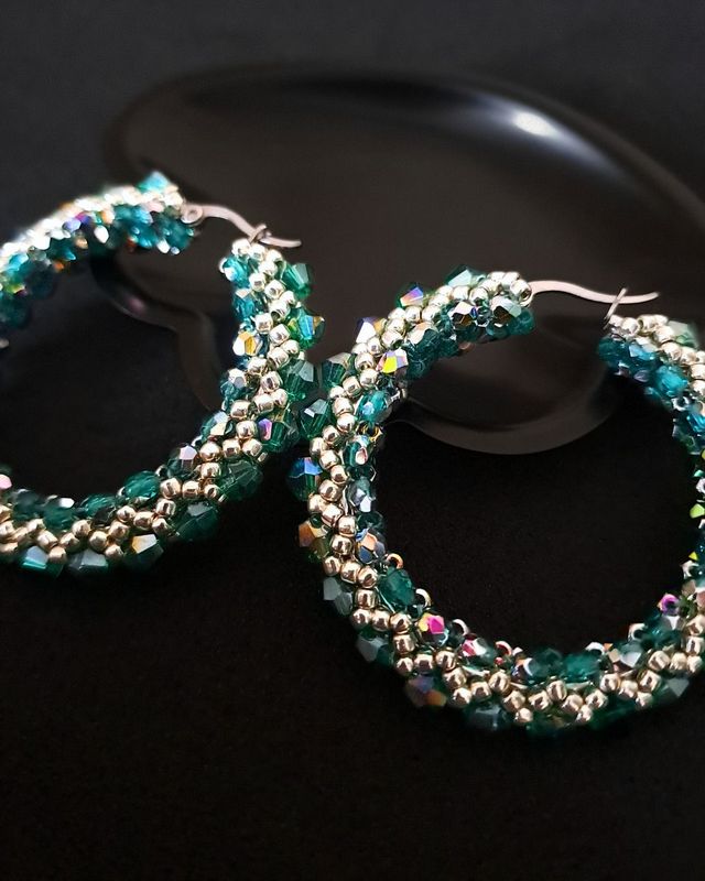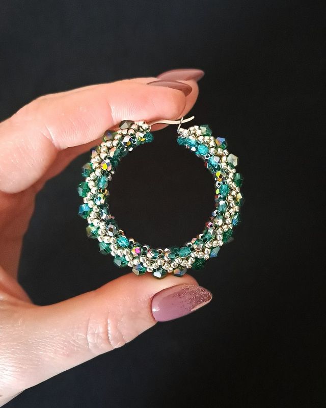Te duże zielone kolczyki koła z kryształkami powstały z myślą o tych, które nie boją się akcentu z charakterem. Każdy kolczyk został ręcznie opleciony na okrągłej bazie ze stali nierdzewnej – koralikami TOHO, błyszczącymi firepolish i szklanymi kryształkami w odcieniach zieleni i srebra.