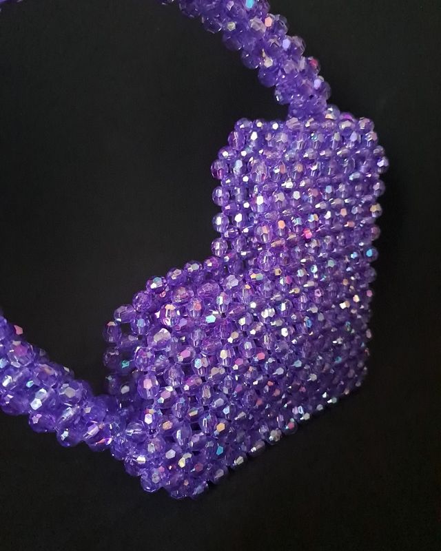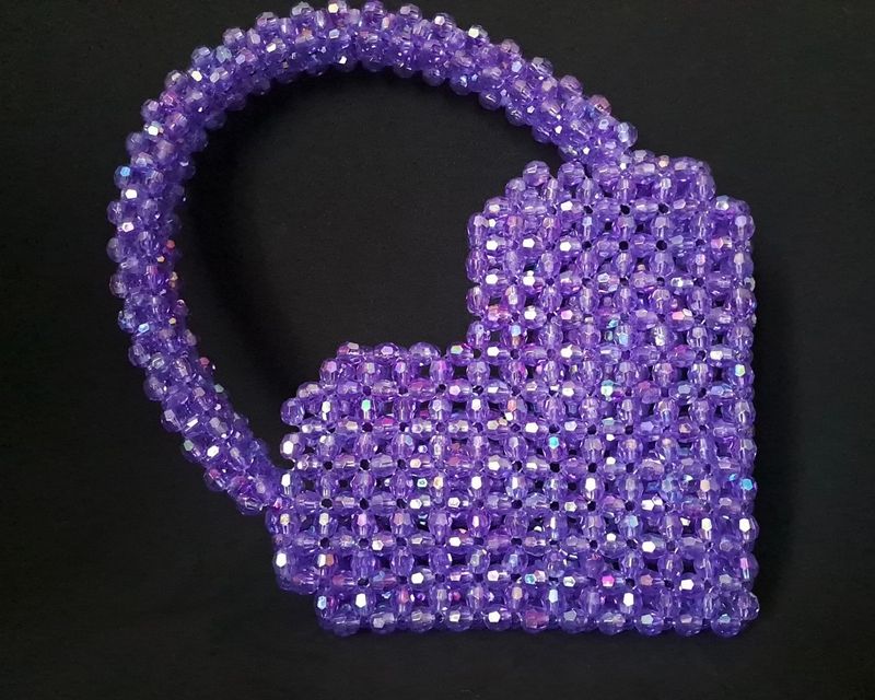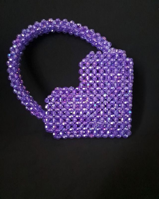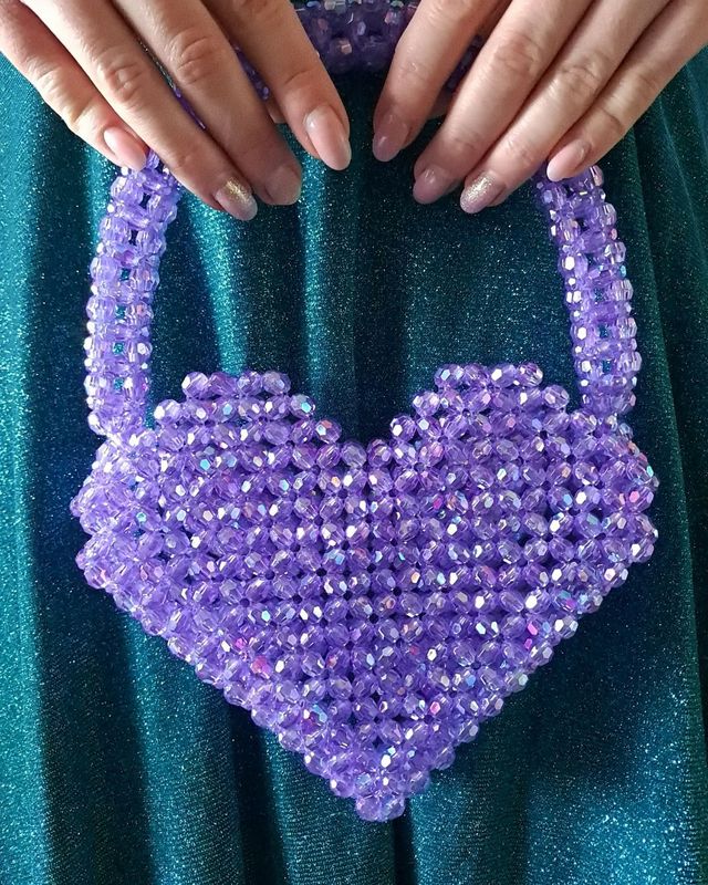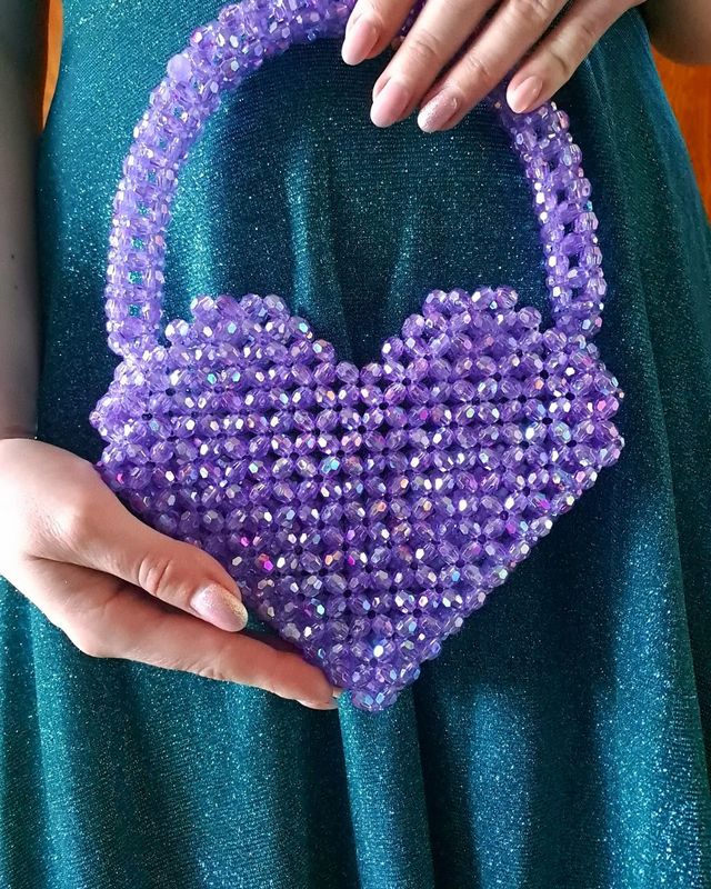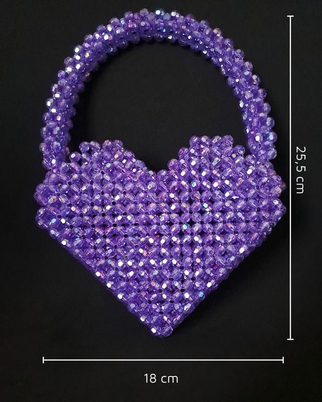 Każdy szczegół tej fioletowej torebki w kształcie serca został starannie wykonany z miłością do rękodzieła. Artystyczne połączenie koralików, misternie splecionych grubą żyłką, tworzy zachwycający efekt migotania i głębi kolorów. Ten unikalny dodatek łączy tradycyjne techniki z nowoczesnym designem, dzięki czemu emanuje ciepłem, pasją i precyzją wykonania. Jego niepowtarzalny wygląd przyciąga wzrok i sprawia, że każda kobieta poczuje się wyjątkowo, niezależnie od okazji.