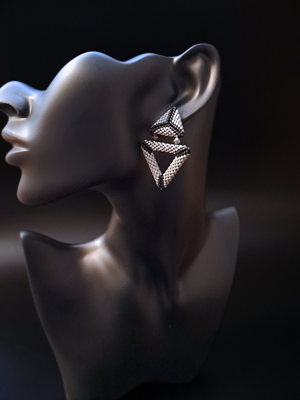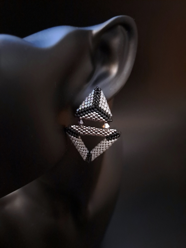 Czy możesz sobie wyobrazić kolczyki, które zdają się żyć razem z Tobą? Te geometryczne cuda to nie tylko ozdoba, ale i artystyczna kompozycja, która odbija światło i subtelnie rozjaśnia Twoją twarz. Każdy ich element, od srebrnych kryształków Preciosa po połączone trójkąty, jest jak muzyczna nuta – tworzy harmonię, którą nosisz z dumą. Mając 5 cm długości, są wystarczająco wyraziste, by przyciągnąć spojrzenia, ale na tyle subtelne, by nie przytłaczać. Idealne na wieczór, pełne blasku, ale też na dzień – jako manifestacja Twojego unikalnego stylu.