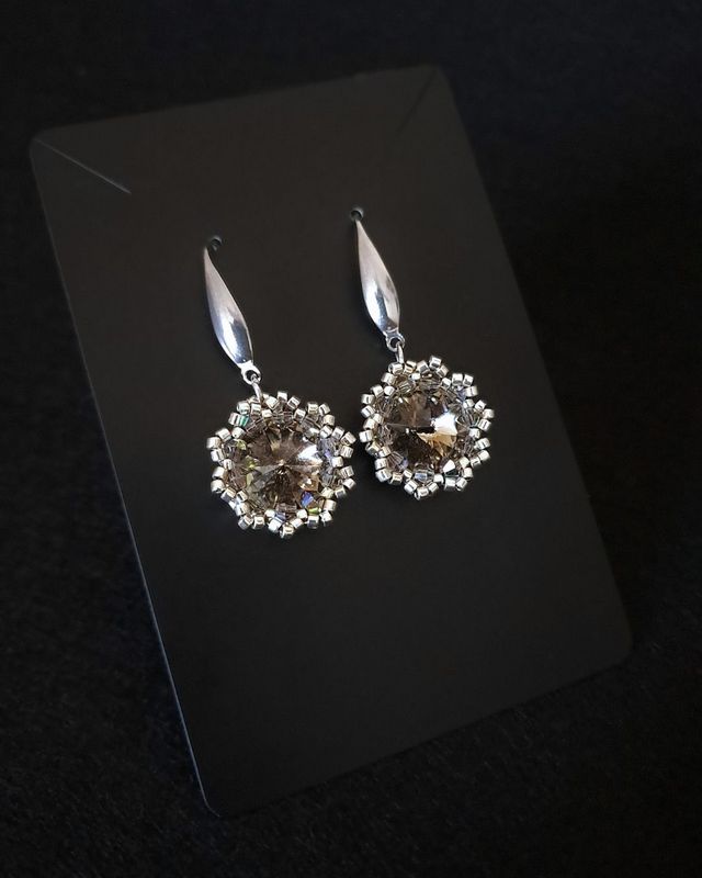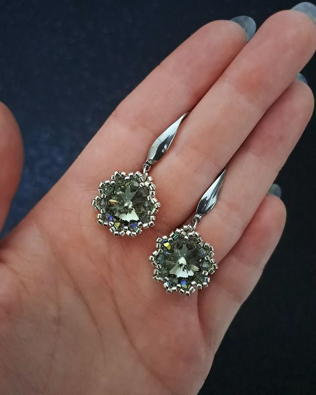 W centrum każdego kolczyka znajduje się kamień Preciosa Rivoli Maxima 12 mm w kolorze Black Diamond, opleciony srebrnymi koralikami Miyuki Delica (galvanized silver) i kryształkami Preciosa Bicone 3 mm Black Diamond AB. Zamocowane na biglach ze stali szlachetnej – hipoalergicznych i trwałych.