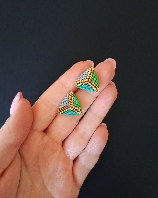 Każdy kolczyk został utkany z koralików Miyuki Delica – perfekcyjnie równych, lekko połyskujących. Ściegiem peyote uformowano je w trójkąty 1,5 × 1,5 cm. Koraliki w odcieniach zieleni, szarości i złota tworzą harmonijną kompozycję – stonowaną, ale z pazurem. Metalowe elementy to stal nierdzewna w kolorze złotym – hipoalergiczna, trwała, wygodna.