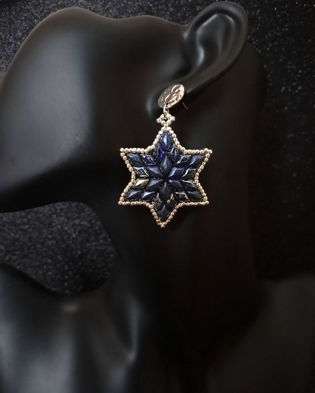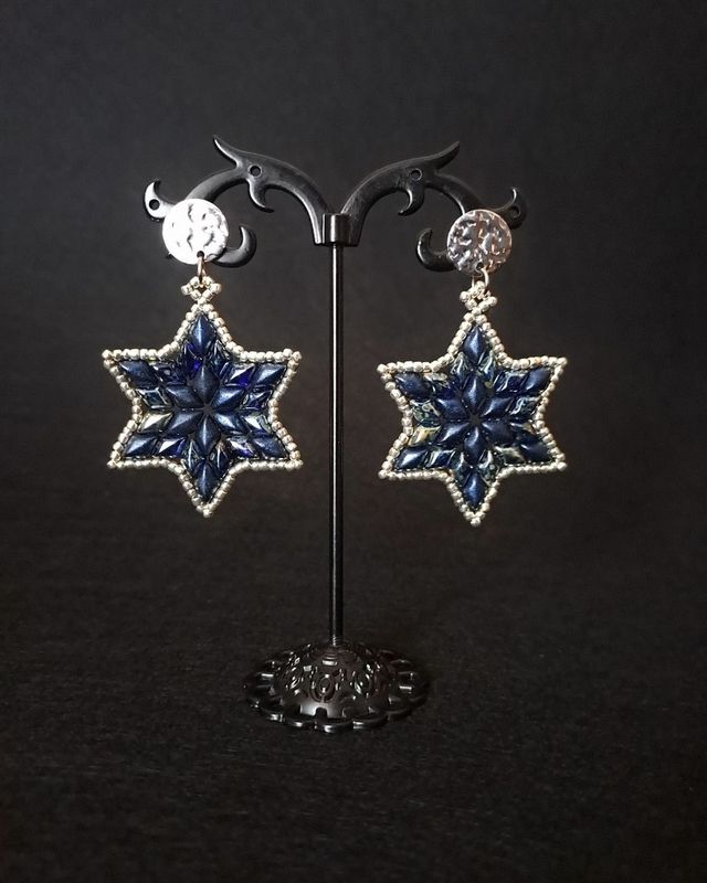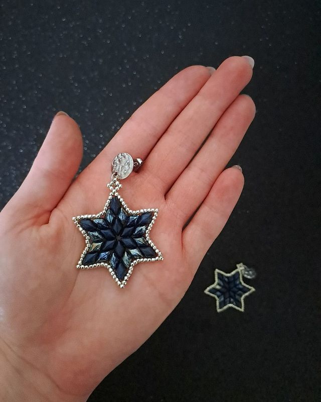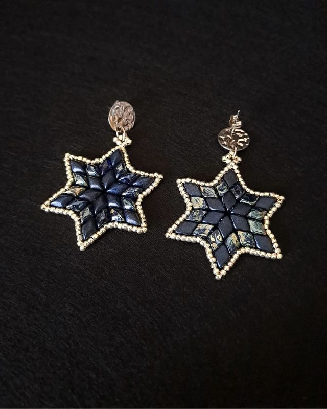 Kolczyki mają formę sześciopromiennych gwiazdek, wykonanych ręcznie z koralików Gemduo i Toho, które pięknie łapią światło. Całość uzupełniają sztyfty ze stali nierdzewnej w kolorze srebra – eleganckie, trwałe i hipoalergiczne.