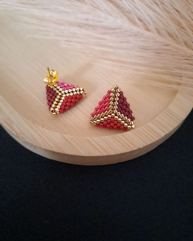 ❤️ Ręcznie wykonane kolczyki w kształcie trójkątów, w odcieniach czerwieni, złota i brązu