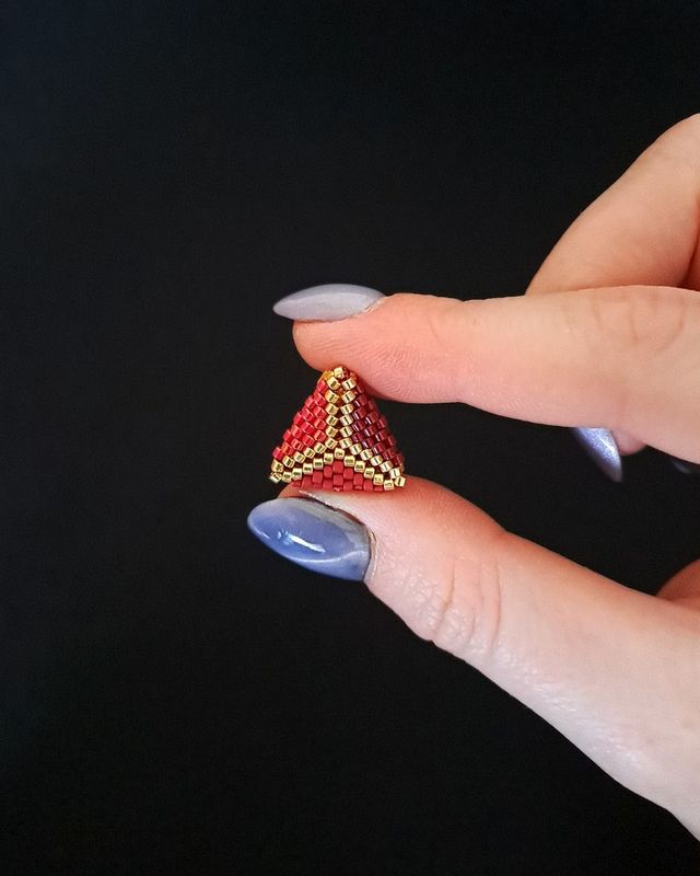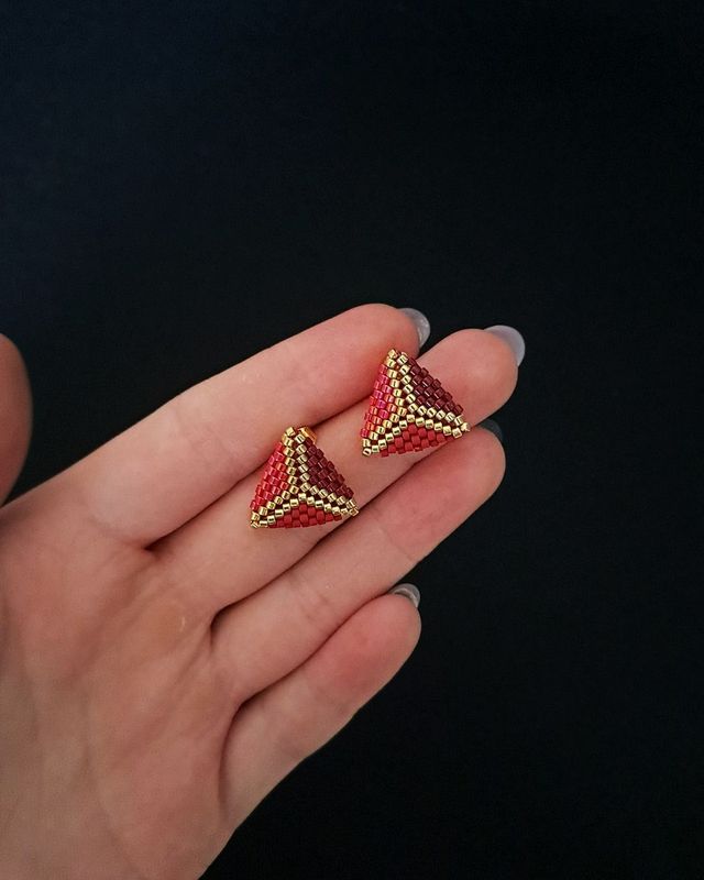 Kolczyki mają formę geometrycznych trójkątów o wymiarach 1,5 × 1,5 cm, utkanych ściegiem peyote – znanym z rytmicznej struktury i elastycznego splotu.