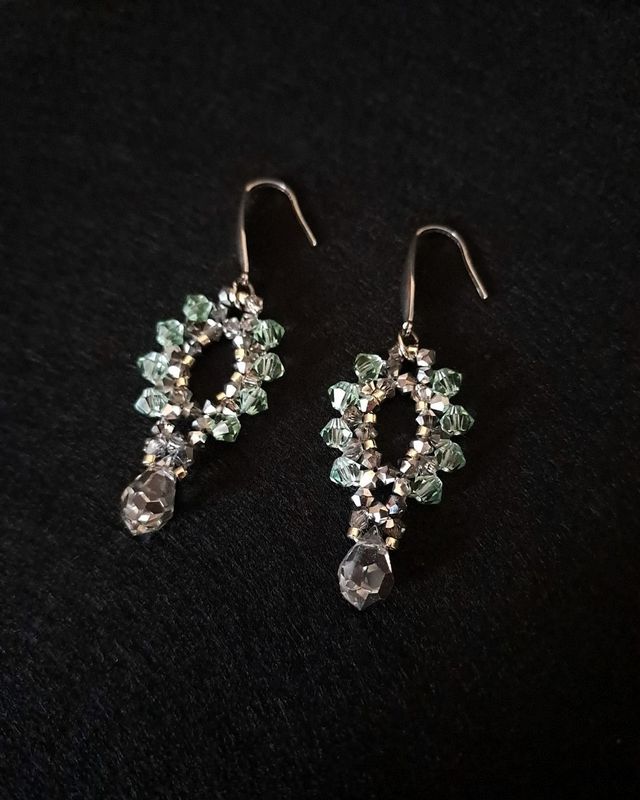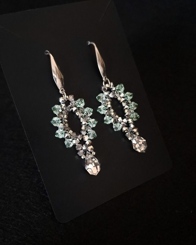 Kolczyki zostały stworzone z kryształków Preciosa Bicone Chrysolite (4 mm) oraz Preciosa Labrador Half (3 mm). Połączenie mięty i metalicznego srebra daje efekt delikatnego połysku, który zmienia się wraz z ruchem.