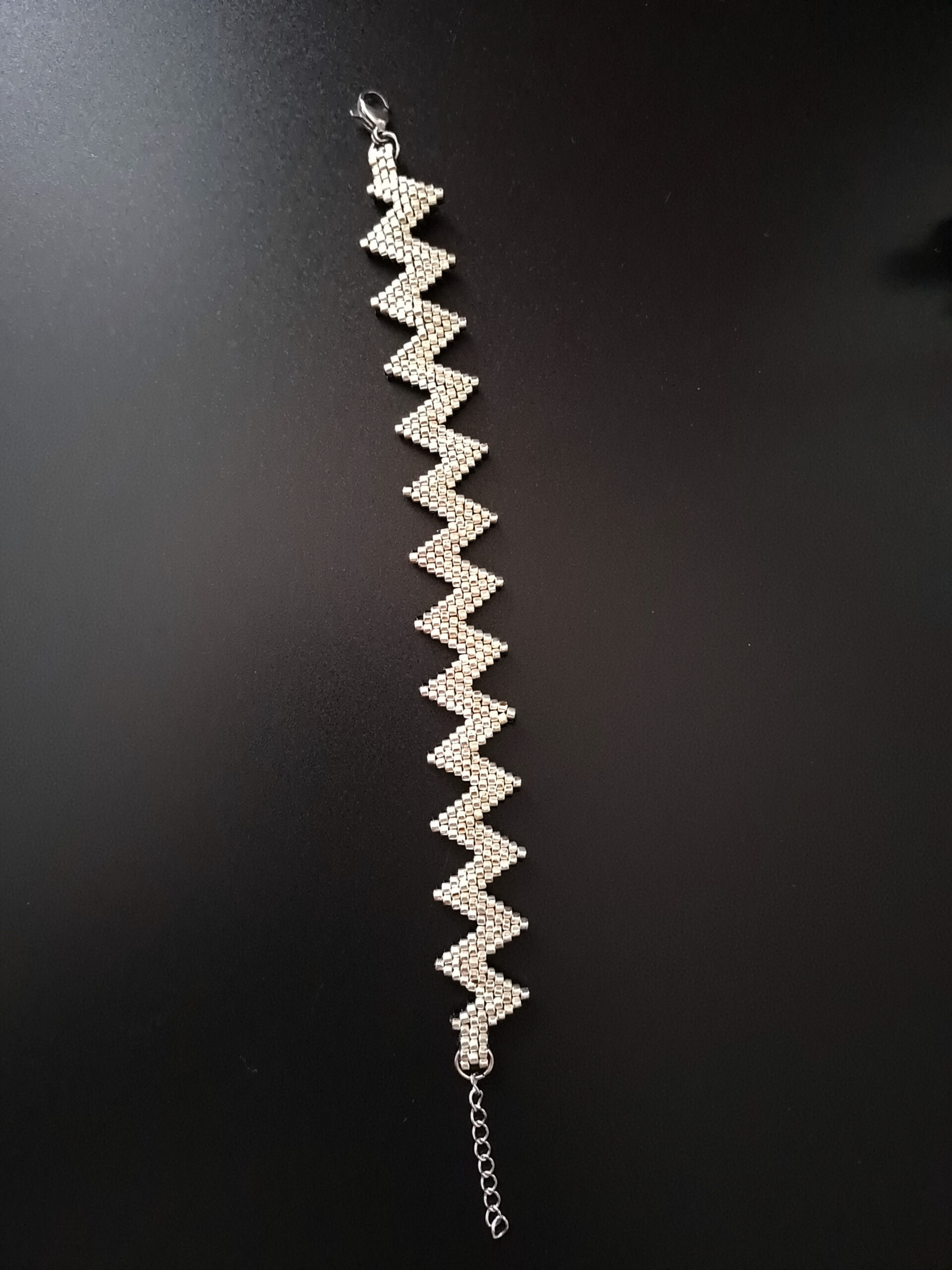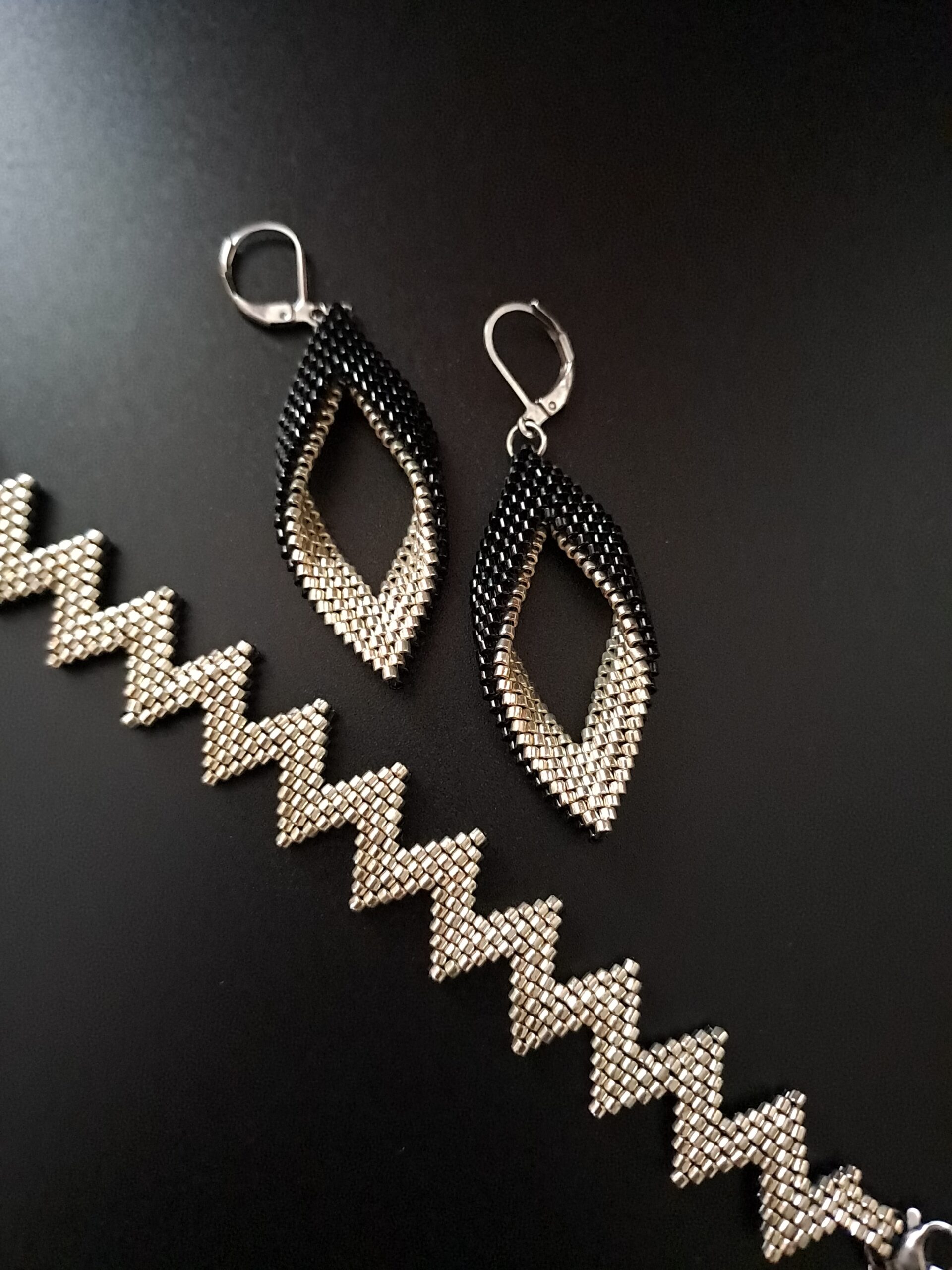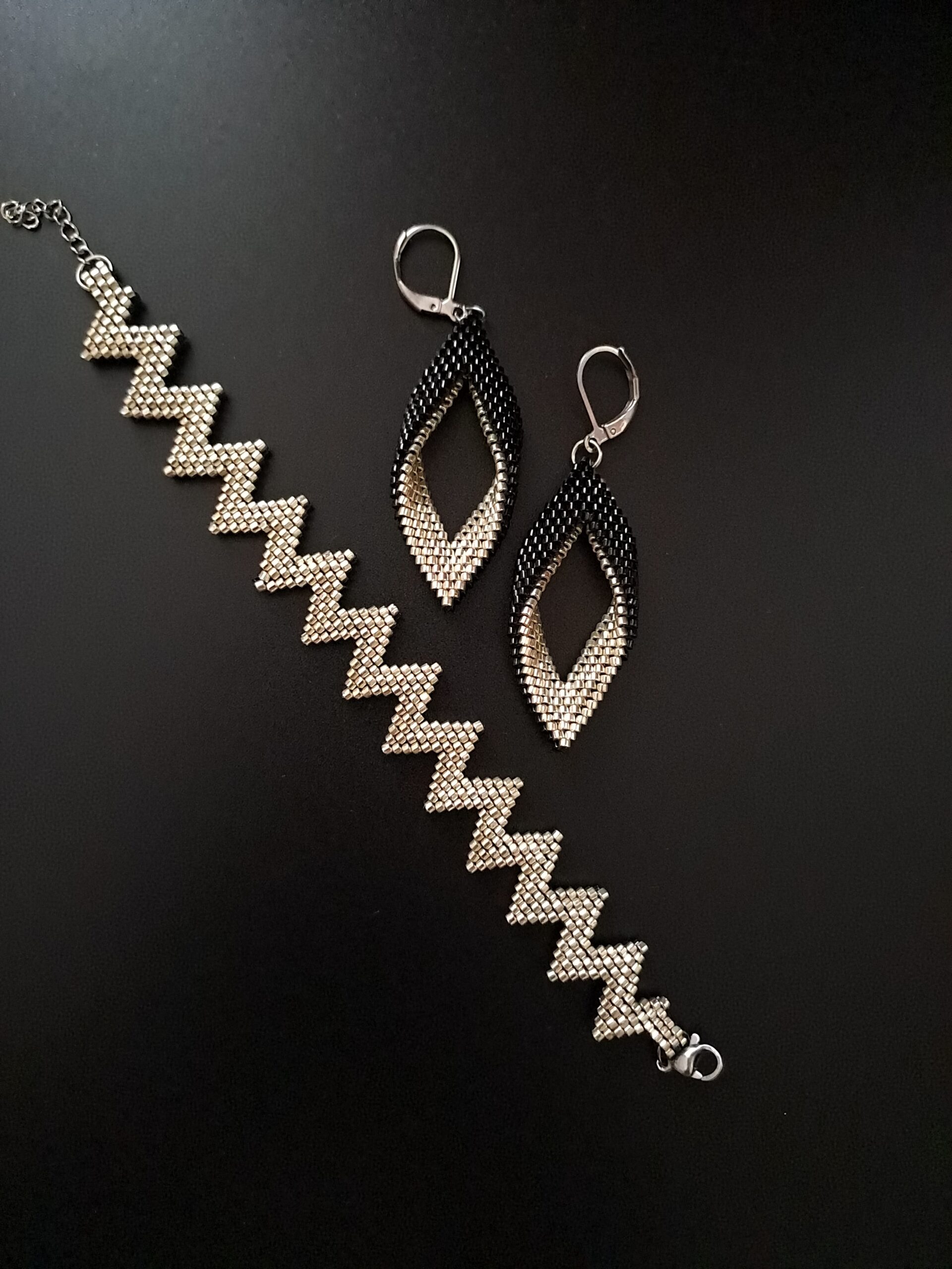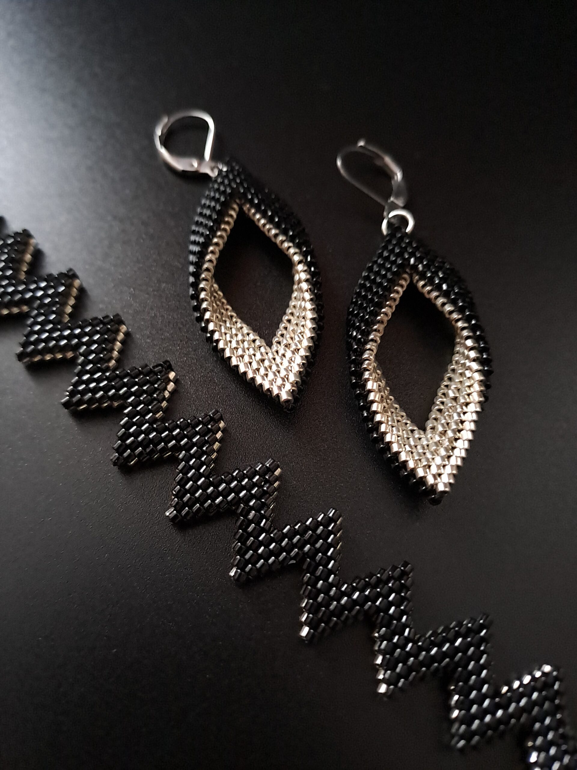 Bransoletka dostępna jest w rozmiarze idealnym na nadgarstek o obwodzie 14,5-16,5 cm, a kolczyki o wymiarach 6×2 cm idealnie dopełniają całość. Marzysz o innym kolorze lub rozmiarze? Skontaktuj się ze mną – wykonam zestaw „Black ZigZak” dopasowany do Twoich preferencji, dzięki czemu Twoja biżuteria będzie jeszcze bardziej unikatowa.