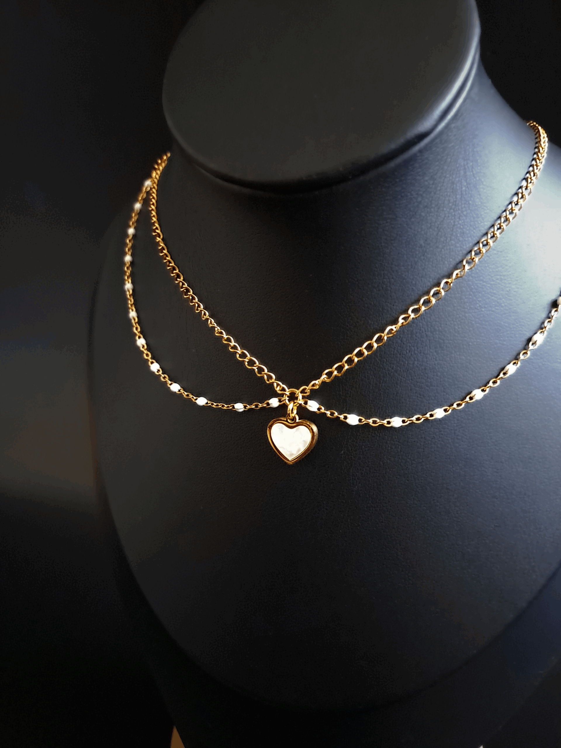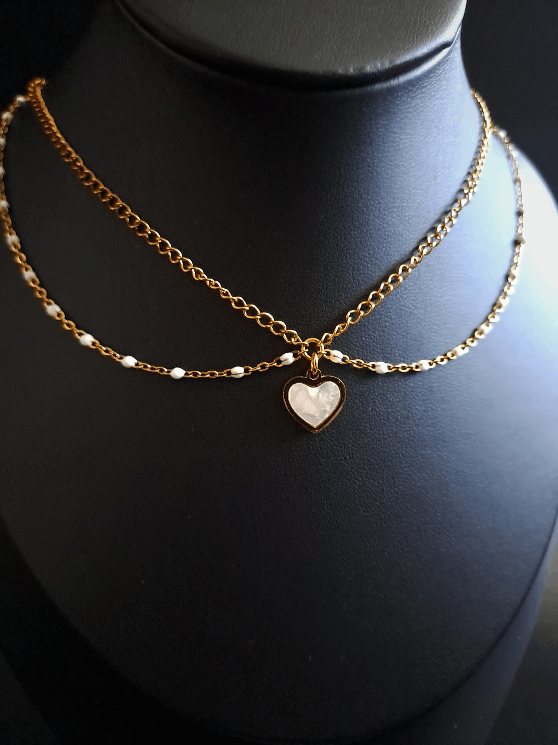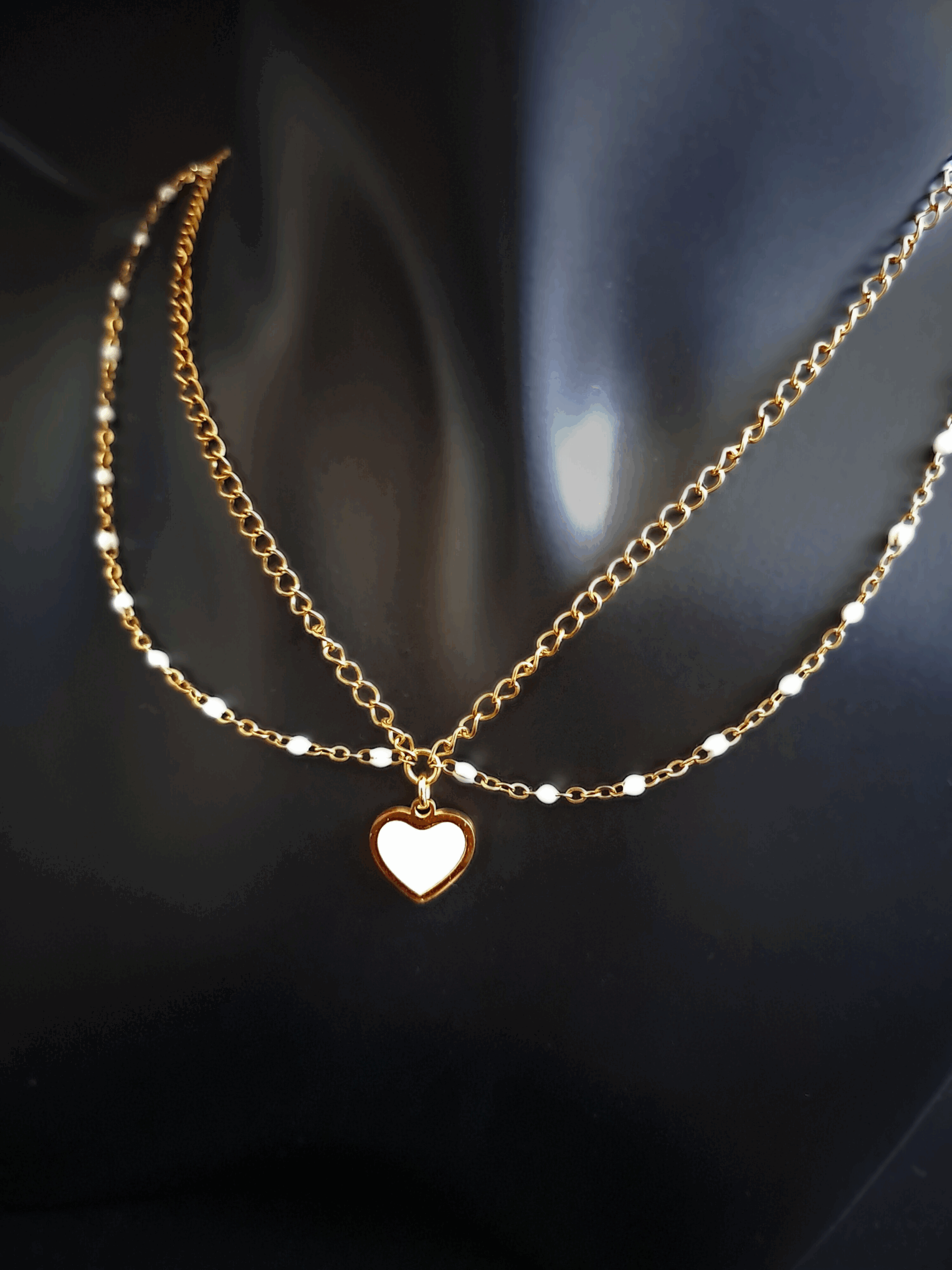 Naszyjnik wykonany ze stali nierdzewnej w odcieniu złota zapewnia długotrwały blask i trwałość. Dwurzędowy projekt to klasyka wzbogacona białymi akcentami, które dodają subtelności i wdzięku. Zawieszka w kształcie serca wypełniona masą perłową to nie tylko elegancki akcent – to również symbol harmonii i spokoju. Złoto i perła razem tworzą luksusowy duet, idealnie pasujący do różnorodnych stylizacji.
