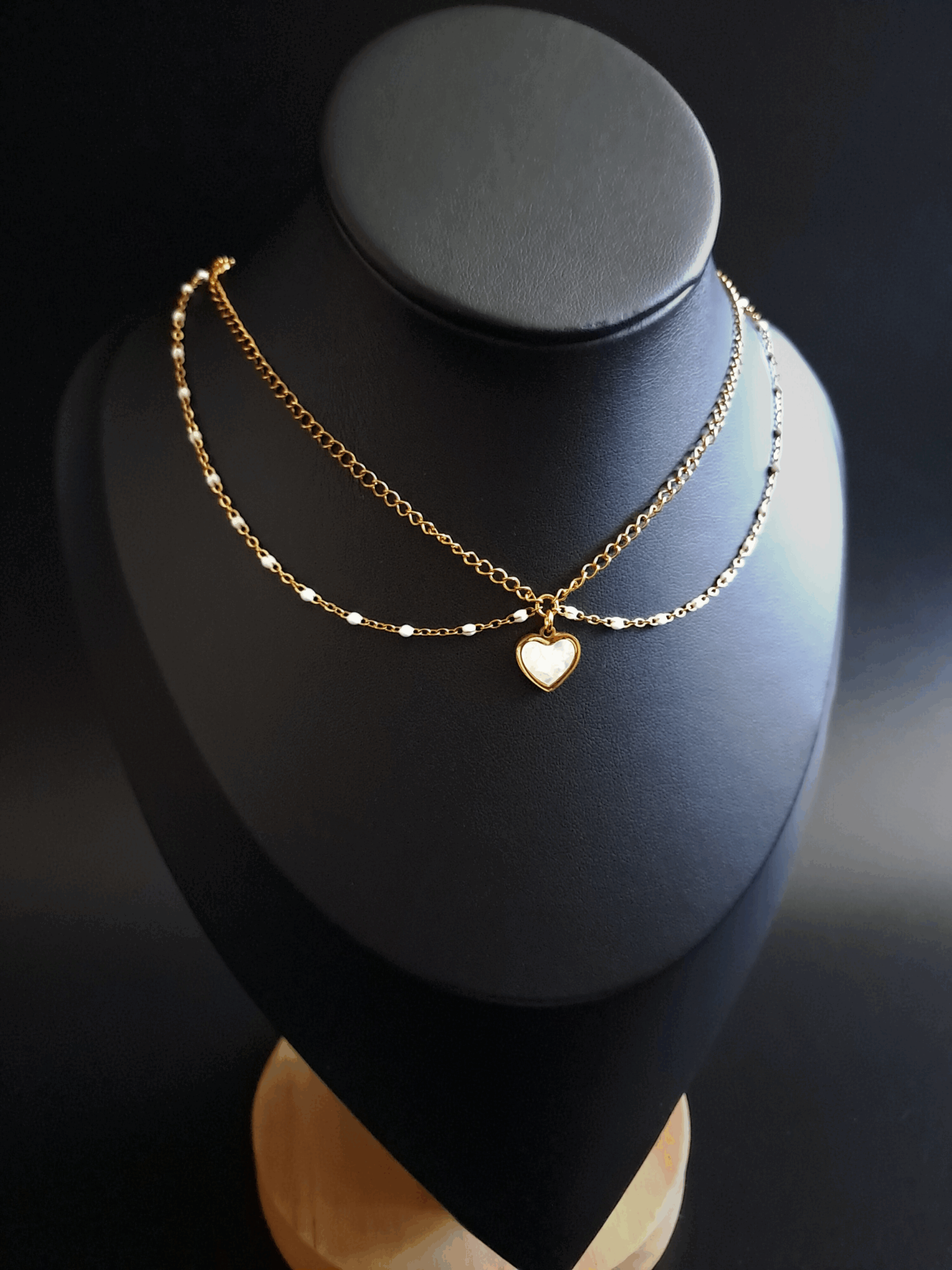 Czy szukasz biżuterii, która przyciągnie wzrok i doda Twojemu stylowi luksusowego blasku? Ten ręcznie wykonany, złoty naszyjnik z sercem z masy perłowej to coś więcej niż dodatek. To symbol elegancji i wyrafinowanego smaku, który doda magii każdej chwili. Dwurzędowy łańcuszek z białymi akcentami, zakończony perłowym sercem, natychmiast przyciąga uwagę i wnosi nutę romantyzmu i ponadczasowego stylu do każdej stylizacji.