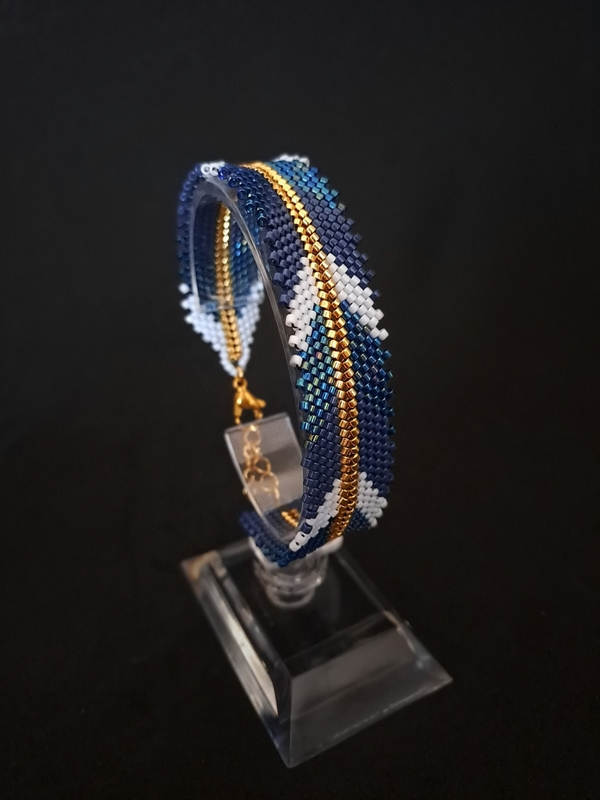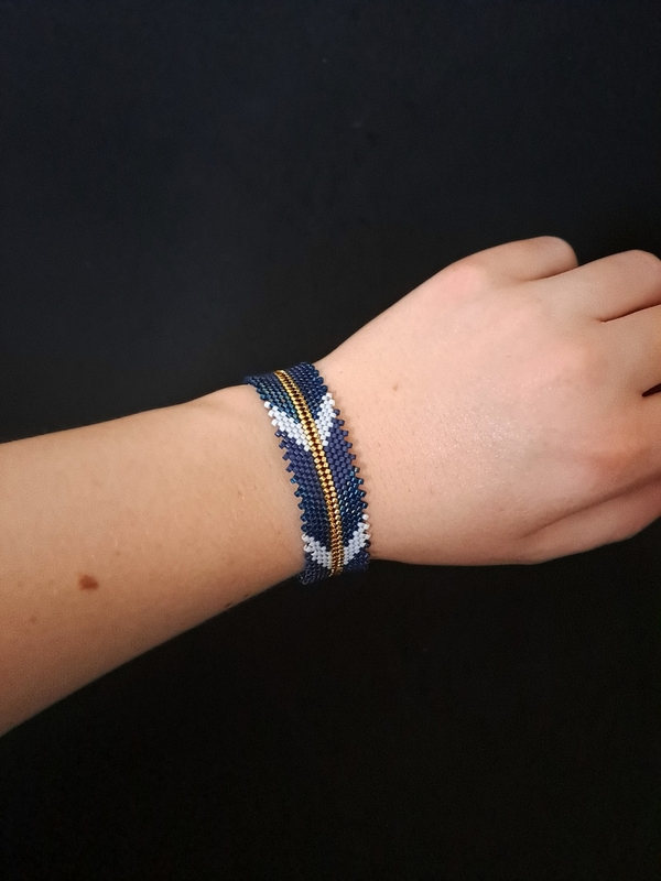 Ta elegancka niebieska bransoletka z eleganckim wzorem jodełki harmonijnie łączy klasyczny styl z nowoczesnym designem. Stworzona ręcznie przy użyciu techniki peyote, ta biżuteria wyróżnia się precyzją wykonania i luksusowym charakterem. Trzy odcienie błękitu połączone ze złotymi akcentami sprawiają, że to idealny wybór dla kobiety ceniącej elegancję i oryginalność.