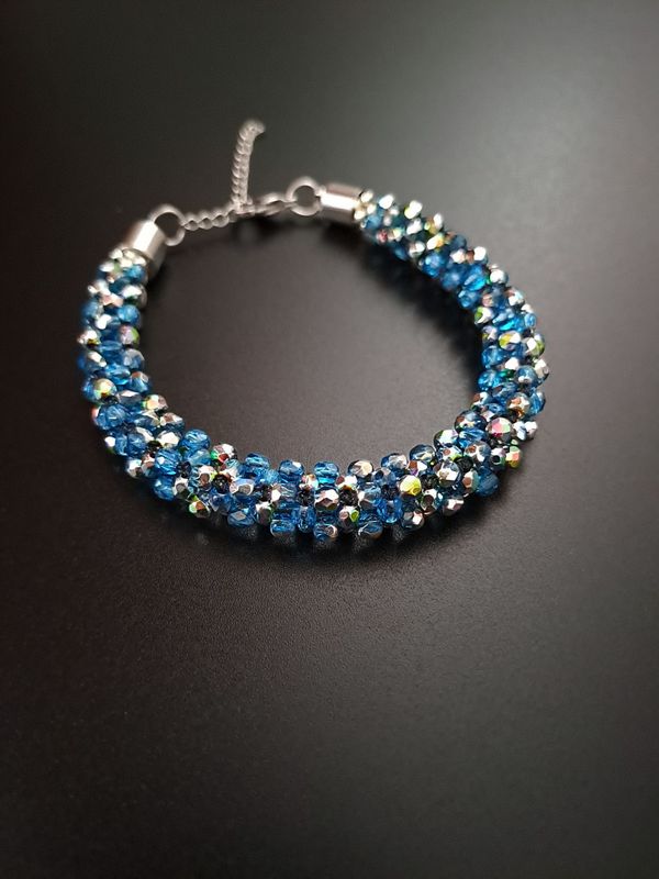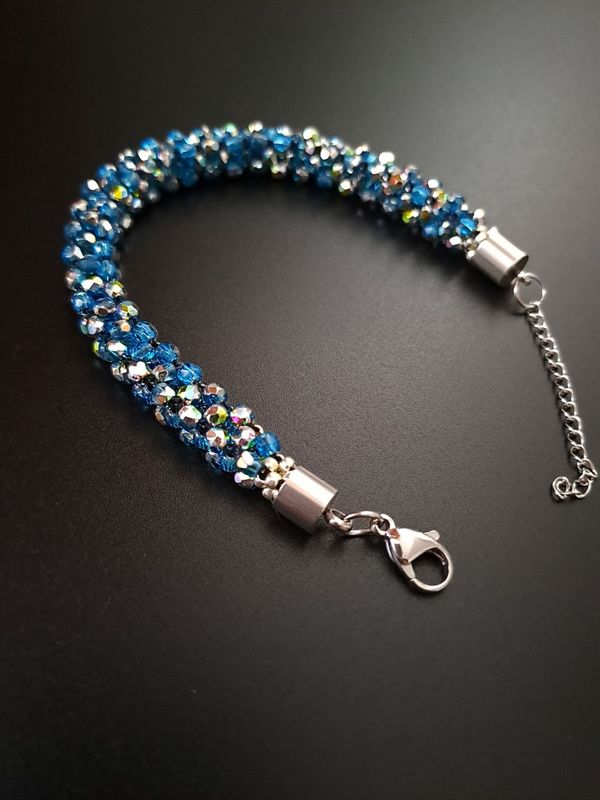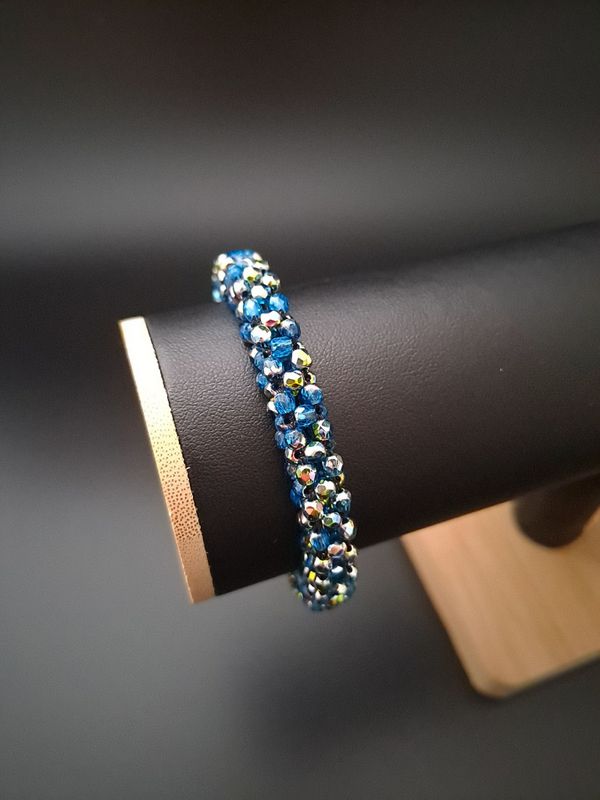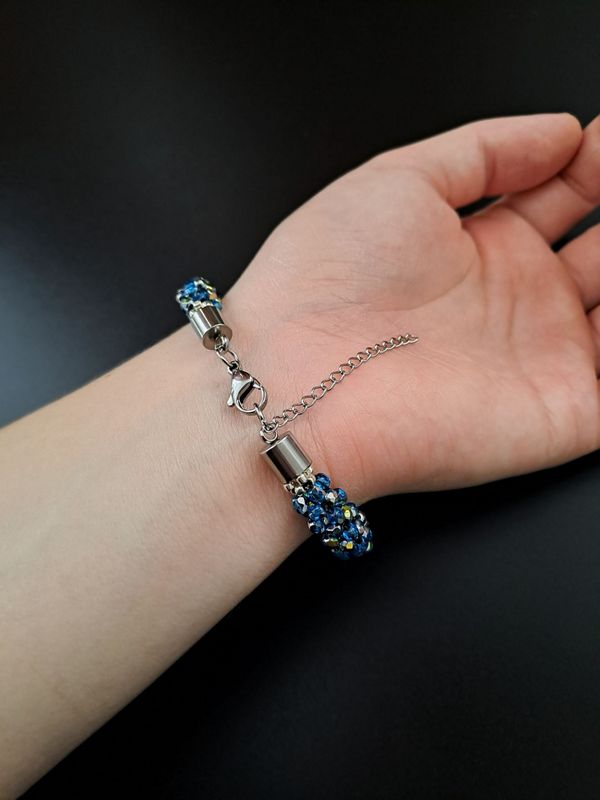 Bransoletka wykonana jest z drobnych, precyzyjnie oszlifowanych kryształków Fire Polish w głębokim niebieskim kolorze. Dzięki ich metalicznej powłoce, każdy ruch sprawia, że bransoletka mieni się delikatnymi refleksami, przyciągając wzrok z daleka. Idealnie wkomponuje się zarówno w codzienne stylizacje, jak i te bardziej formalne, dodając im wyjątkowego uroku i klasy.