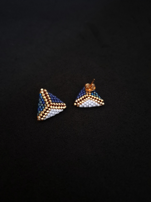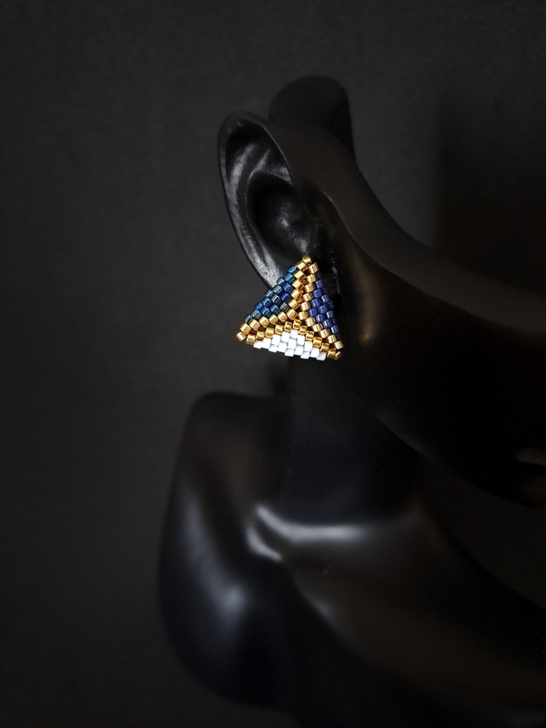 Kolczyki zostały misternie wykonany ręcznie, przy użyciu koralików Miyuki Delica – znanych z precyzyjnego kształtu i idealnej symetrii. Dzięki wykorzystaniu ściegu peyote, kolczyki są nie tylko estetyczne, ale również lekkie i wygodne, co zapewnia komfort noszenia przez cały dzień. Ich złote akcenty wspaniale kontrastują z niebieskim, dodając delikatnego blasku, który wyróżni Cię z tłumu.