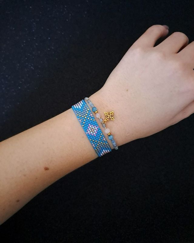 Bransoletka tkana na krośnie: koraliki Miyuki Delica w odcieniach różu, błękitu, szarości i złota; szerokość ok. 1,4 cm.