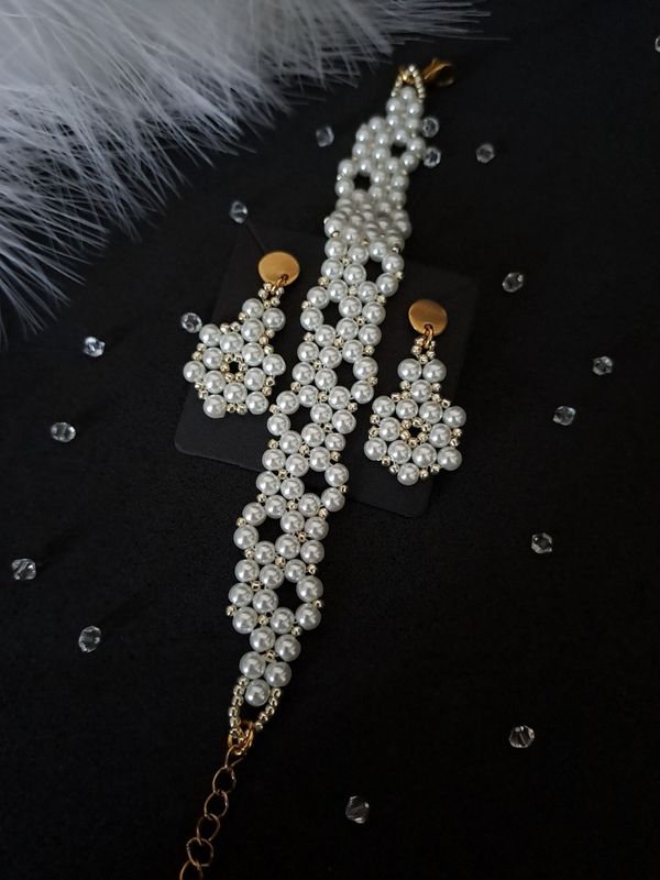 Zestaw biżuterii ślubnej złożony z kolczyków i bransoletki, wykonany z eleganckich szklanych perełek i Koralików TOHO. Kolczyki mają 3,5 cm długości oraz 2 cm szerokości, a bransoletka idealnie pasuje na nadgarstek o obwodzie 16-17,5 cm. Stal nierdzewna zapewnia trwałość i elegancję.