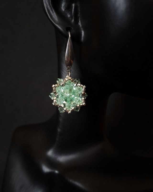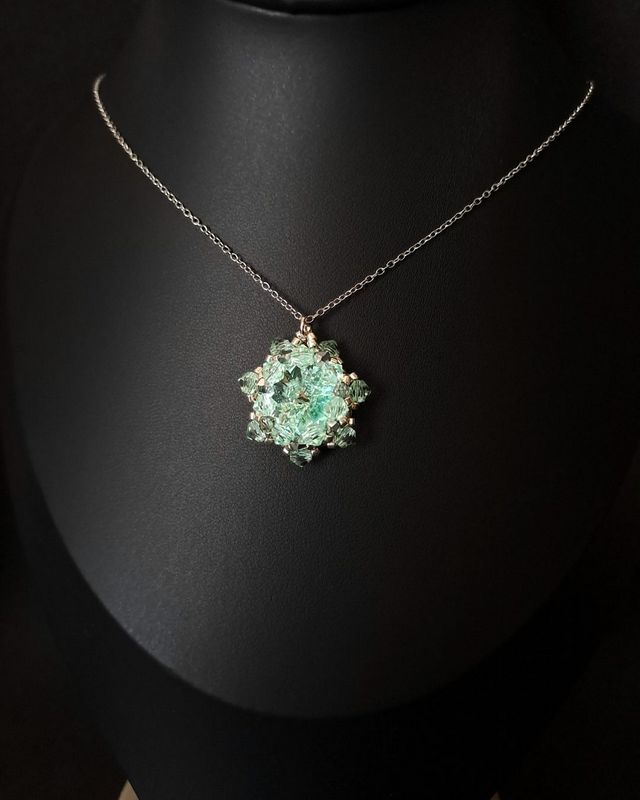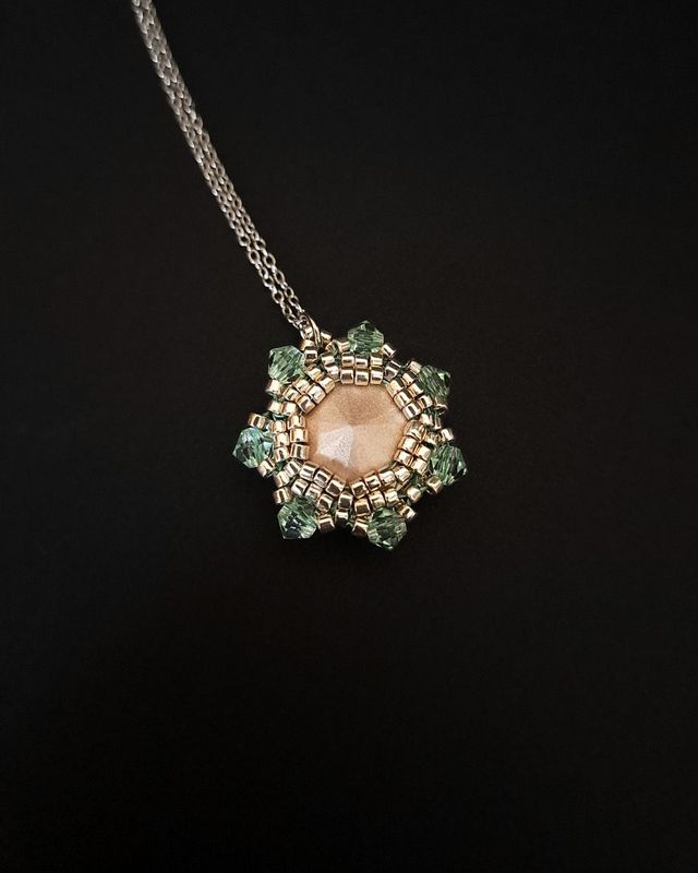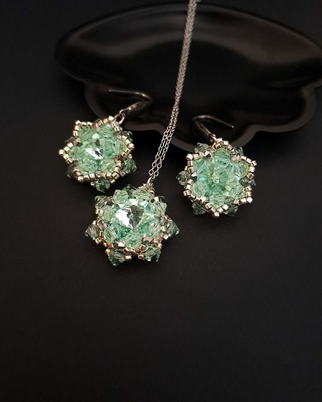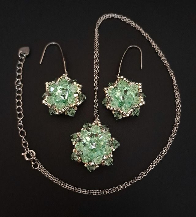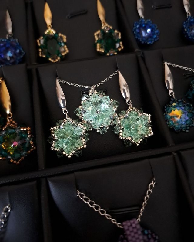 Stworzone ręcznie, z dbałością o najmniejszy detal, kolczyki i naszyjnik z zestawu „Chrysolite” to więcej niż ozdoba – to historia. Kamienie Preciosa Rivoli Maxima oplecione są kryształkami Bicone w odcieniach chrysolite i labrador half oraz koralikami Miyuki Delica. Ich układ przenika się niczym światło i cień w leśnym gąszczu – tworząc wyrafinowaną, świetlistą kompozycję.