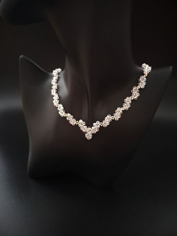 Zestaw biżuterii ślubnej złożony z naszyjnika i bransoletki, wykonany z eleganckich szklanych kryształków i srebrnych koralików Toho. Naszyjnik ma długość 40-45 cm, a bransoletka idealnie pasuje na nadgarstek o obwodzie 15,5-17 cm. Stal nierdzewna zapewnia trwałość i elegancję.