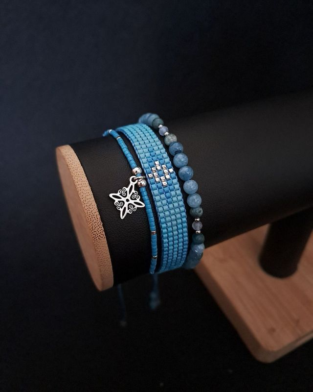- Bransoletka tkana na krośnie: koraliki Miyuki Delica w odcieniach niebieskiego i srebra; szerokość ok. 1 cm.