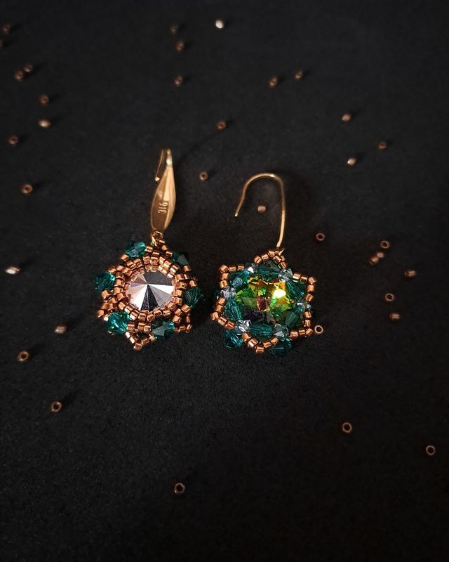 Niech Twoja biżuteria opowiada historie – o elegancji, pewności siebie i wyjątkowym guście. Zielono-Złoty Zestaw Biżuterii „Vitrail Maxima” to kwintesencja wyrafinowanego stylu, który nie tylko zdobi, ale także zachwyca. Kamienie Preciosa Rivoli Maxima w kolorze Vitrail emanują tajemniczym blaskiem – od głębokiej zieleni, przez złote refleksy, aż po akcenty fioletu i pomarańczu. Delikatne kryształki Preciosa i czeskie bicone w kolorach Emerald i crystal vitrail podkreślają blask centralnych kamieni, a koraliki Miyuki Delica w odcieniu brązowego złota dodają subtelnej, luksusowej nuty.